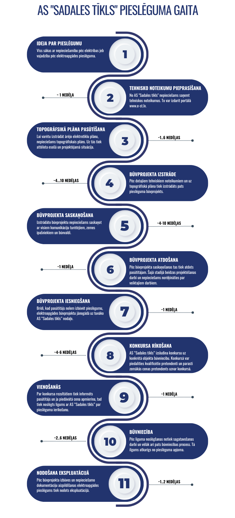Ja nepieciešams jauns AS “Sadales tīkls” elektrības pieslēgums vai rodas vajadzība pārbūvēt esošo pieslēgumu, ir jāizstrādā ārējo tīklu elektroapgādes būvprojekts. Projektēšanas laikā tiek izstrādāts skaidrojošais apraksts, elektrotīklu plāns, vienlīniju shēma, vizualizācija, materiālu specifikācija, darbu apjomi un cita nepieciešamā tehniskā dokumentācija, kas vajadzīga projekta īstenošanai. Bez projekta izstrādes vēl būs jāsaņem saskaņojums no visām iesaistītajām instancēm un zemes īpašniekiem. Projektēšanas darbus var veikt sertificēti projektētāji, tādi esam arī mēs. Zemāk redzamajā infografikā ir aprakstīti visi soļi — no idejas līdz realizācijai.